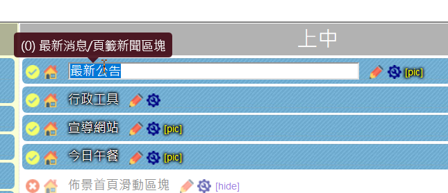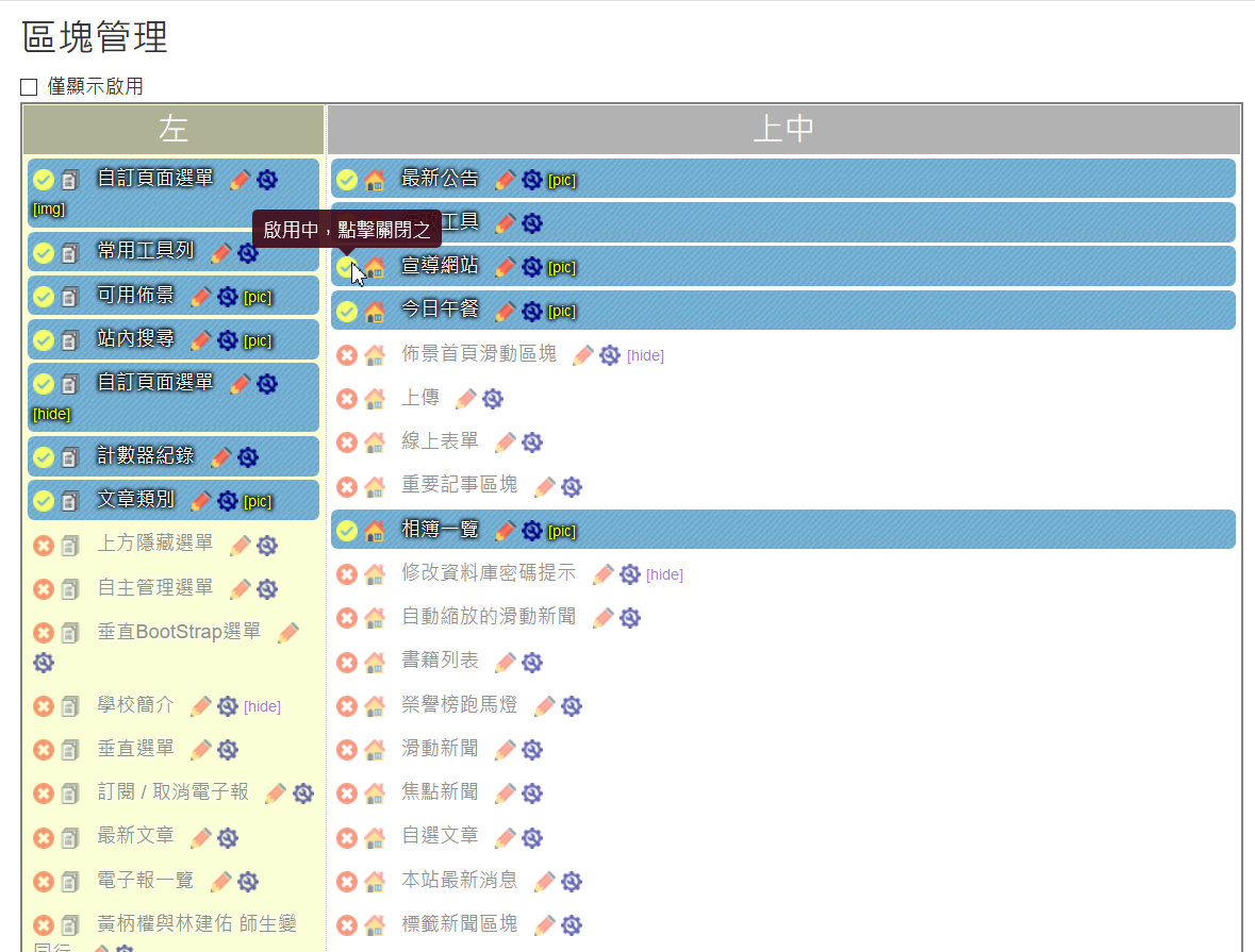 - 列表、編輯表單會顯示目前區塊是否啟用,並可直接切換