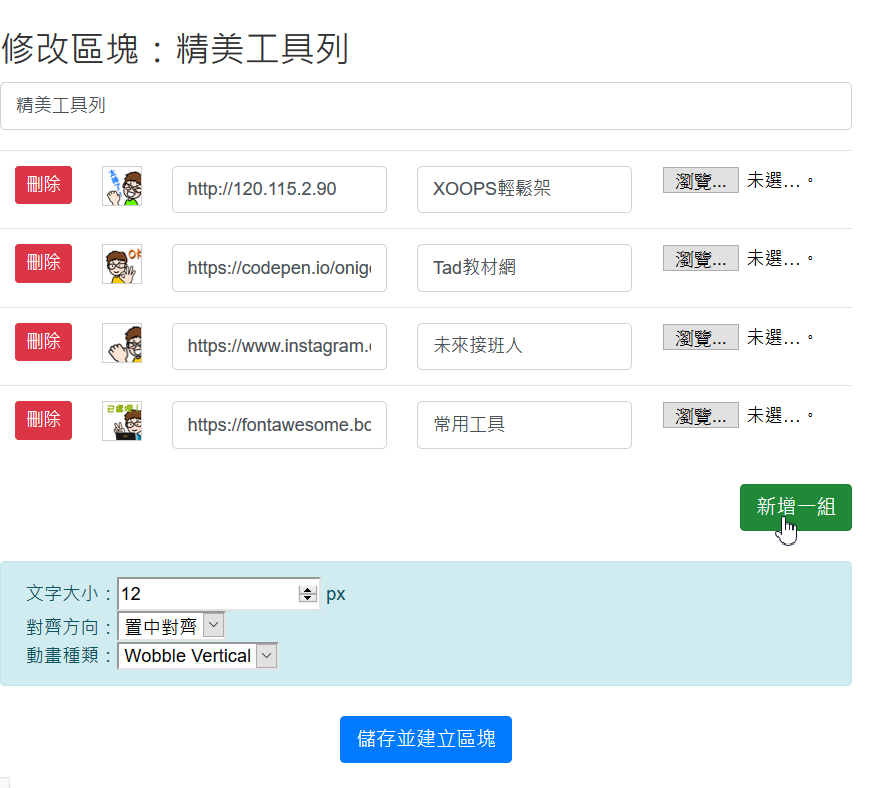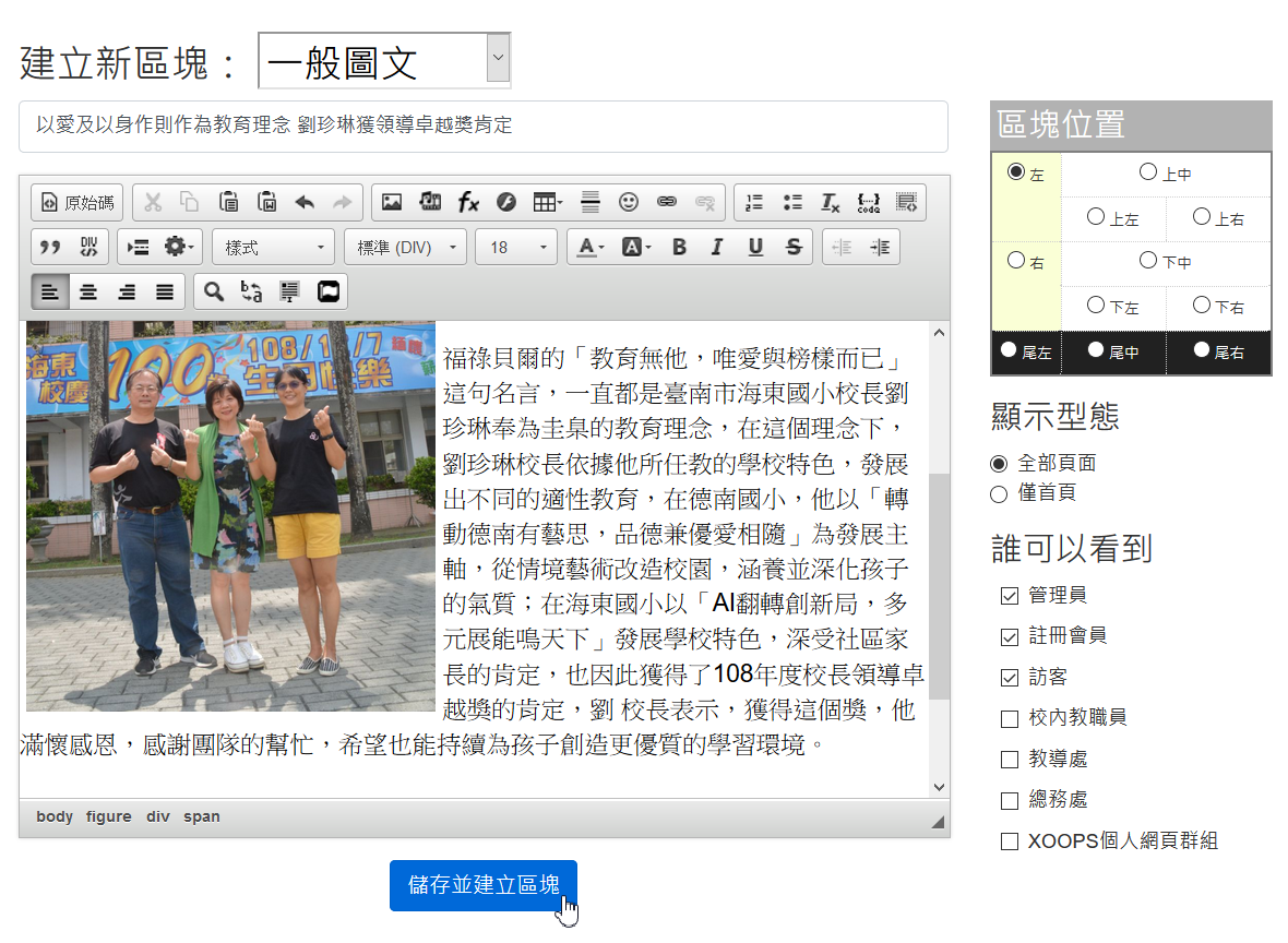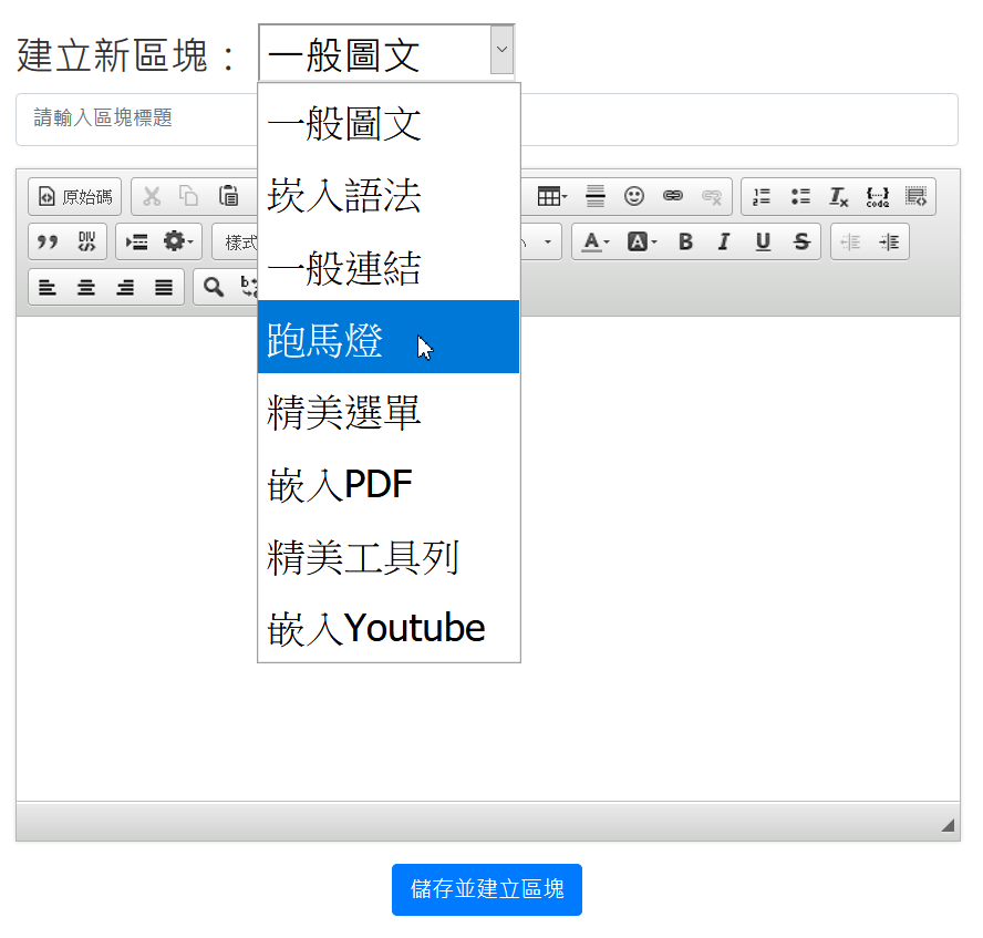 區塊一般只有管理員才能新增,想要讓一般行政人員也可以自行新增區塊的話,勢必得開放管理權限給行政人員,但如此又會造成管理上的困難。此外,一些自訂區塊可能需要上傳圖片、檔案,利用官方的自訂區塊頁面極為不便又不直覺,因此,開發此模組來解決以上問題!